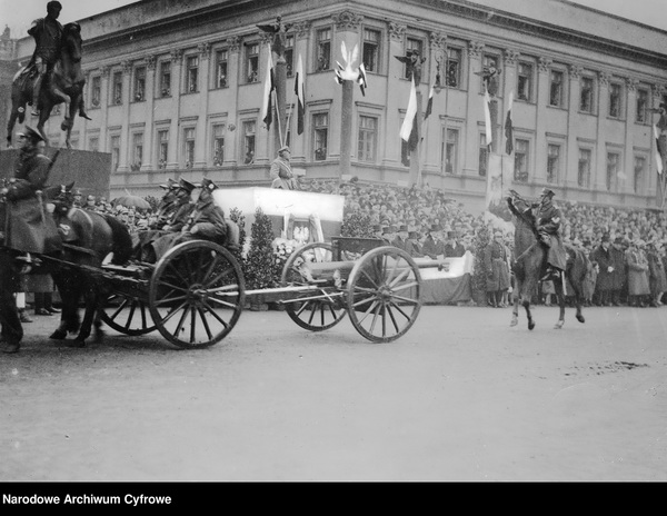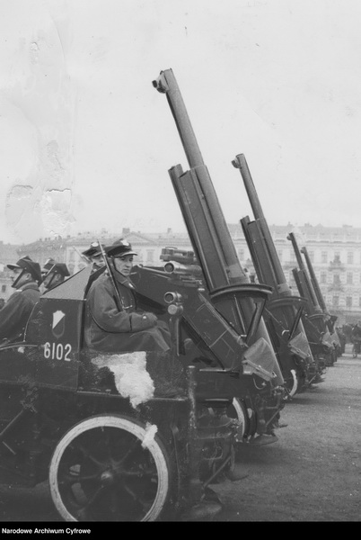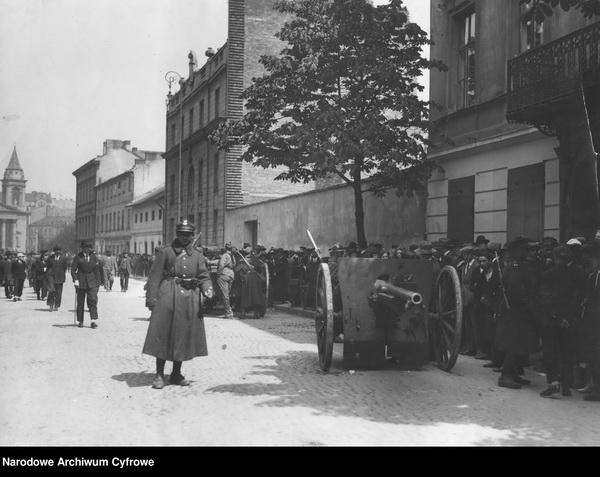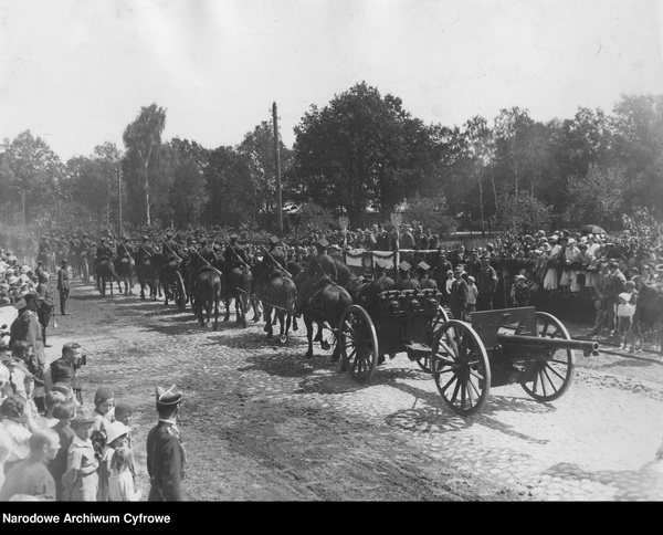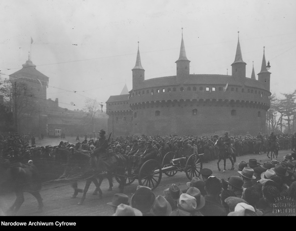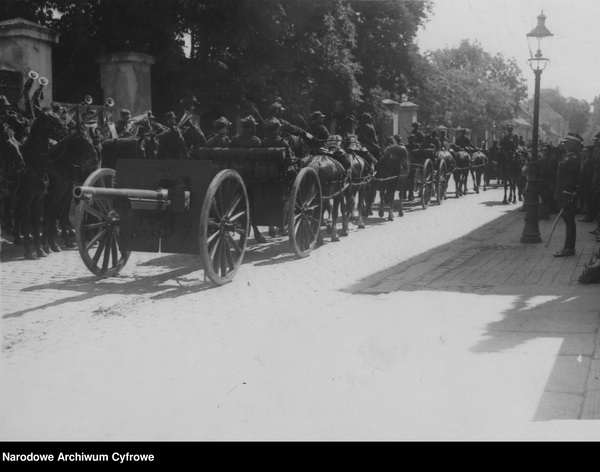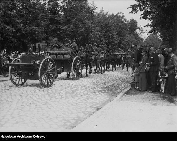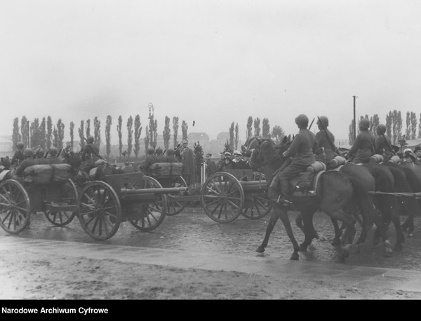 Defilada oddziałów artylerii lekkiej przed Barbakanem. Widoczny zaprzęg z 75 mm armatą polową Schneider wz. 1897