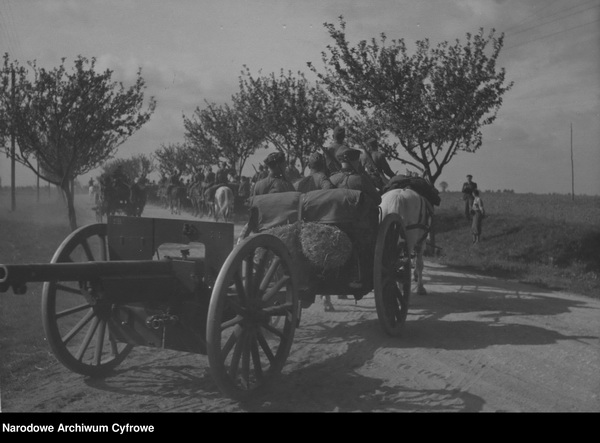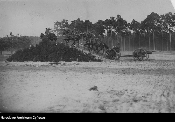 Szkolenie w Szkole Podchorążych w Bydgoszczy. Zaprzęg artyleryjski z 75 mm armatą polową Schneider wz. 1897 pokonuje wzniesienie