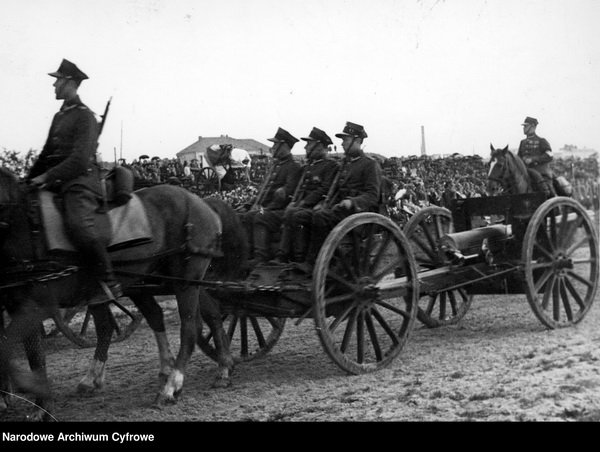 Artyleria podczas defilady na Polu Mokotowskim - 75 mm armata polowa Schneider wz. 1897 z przodkiem i obsługą