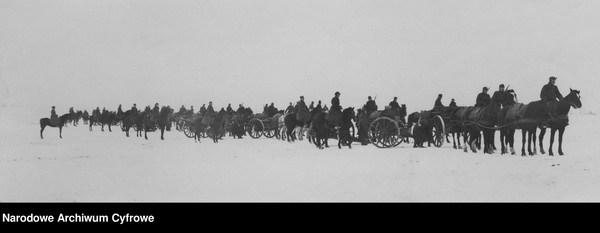 Defilada baterii armat polowych 75 mm wz. 1897 Schneider z przodkiem w trakcji konnej