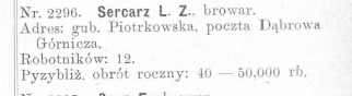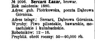 W roku 1896 pojawia się już informacja, również w reklamie prasowej, że browar znajduje się w Dąbrowie pod Będzinem. Zgodnie z zapisem w reklamie browar specjalizował się w produkcji piw bawarskich i marcowych, jak również produkował słód do dalszej odsprzedaży.