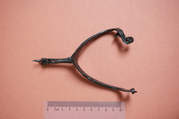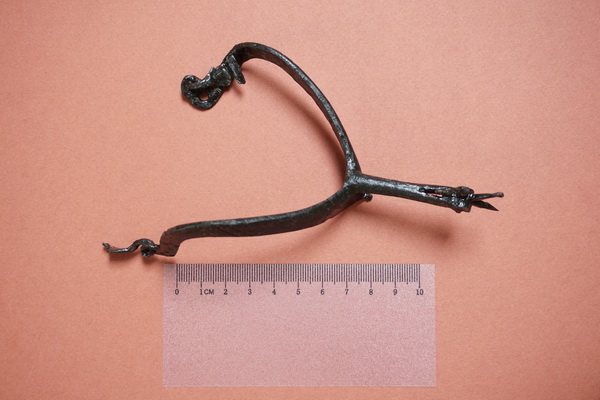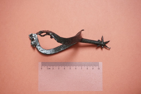 Ostroga, znaleziona podczas systematycznych poszukiwań prowadzonych na podstawie pozwolenia Lubelskiego Wojewódzkiego Konserwatora Zabytków (LWKZ), jest wyjątkowo dobrze zachowana. Składa się z kabłąka w kształcie litery V z silnie, łukowato wygiętymi ramionami. Największe wygięcie ramion przypada na odcinek sąsiadujący z zaczepami płytkowymi, które wyposażone są w dwa otwory. Jeden z zaczepów jest uszkodzony, co skutkuje brakiem części z jednym otworem, jednak zachowały się dwie blaszki umocowane w pozostałych otworach. Dodatkowo ostroga posiada gwiaździste kółko (bodziec) pierwotnie z sześcioma promieniami, umieszczone w widełkach.