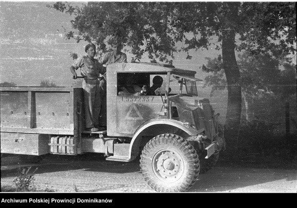 Ciężarówka Ford lub Chevrolet z 1 szwadronu Pułku 4 Pancernego „Skorpion”. Na ciężarówce żołnierze Pułku