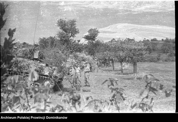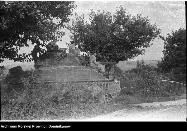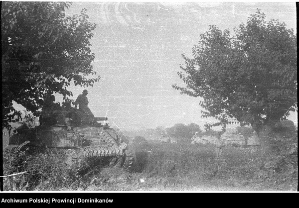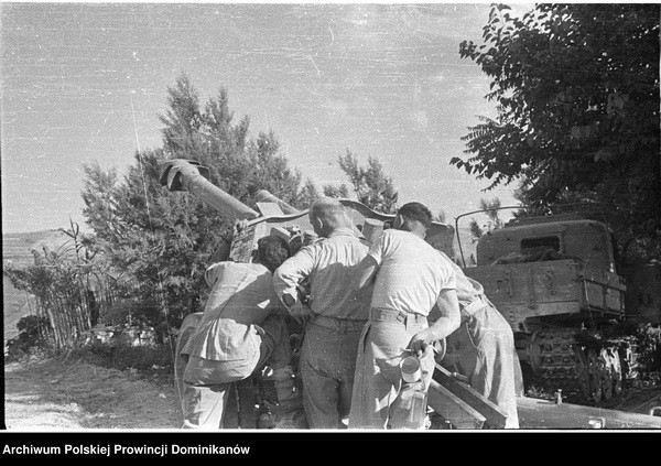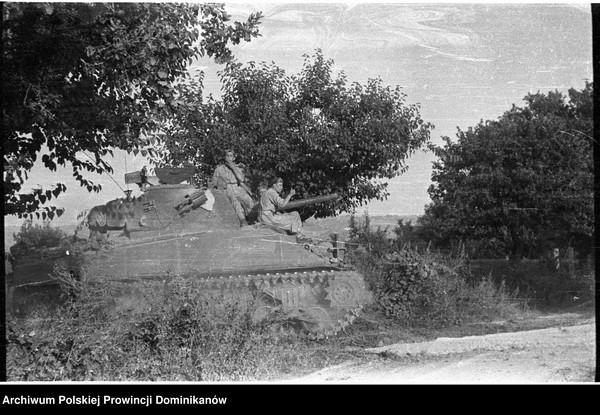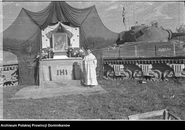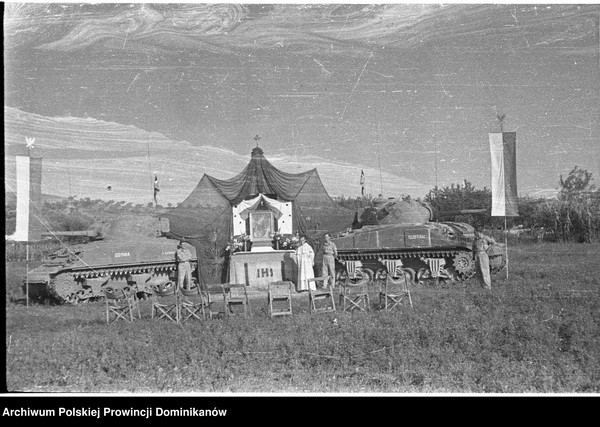Ołtarz polowy flankowany przez czołgi Sherman III „GDYNIA” i „GUSTAW” z dowództwa Pułku 4 Pancernego „Skorpion”. Pośrodku o. Adam Studziński OP