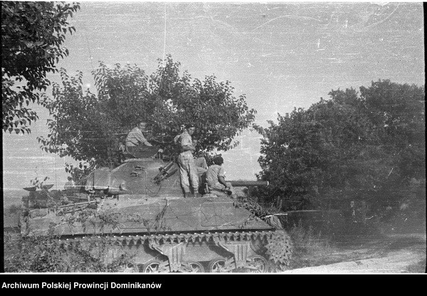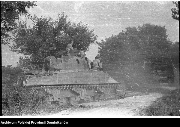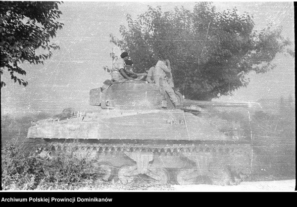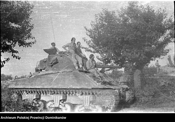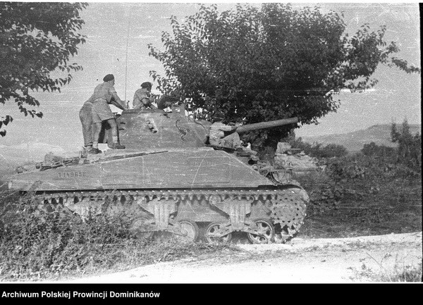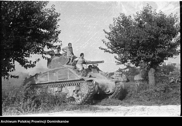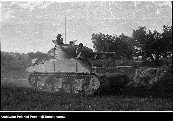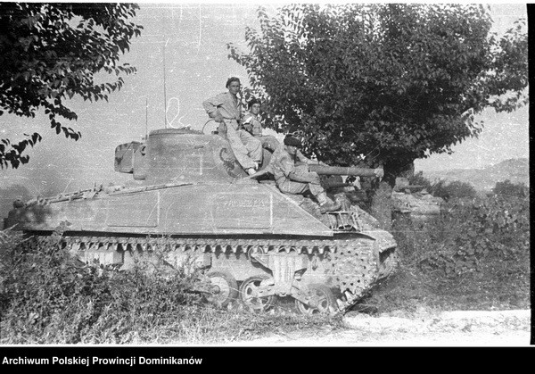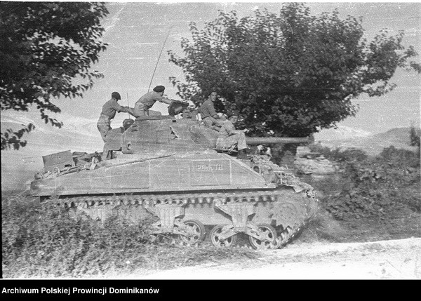 Czołg Sherman III z 1 szwadronu Pułku 4 Pancernego „Skorpion”. Na czołgu żołnierze Pułku