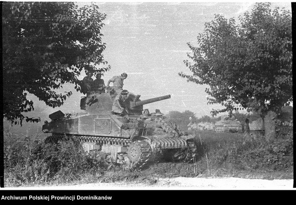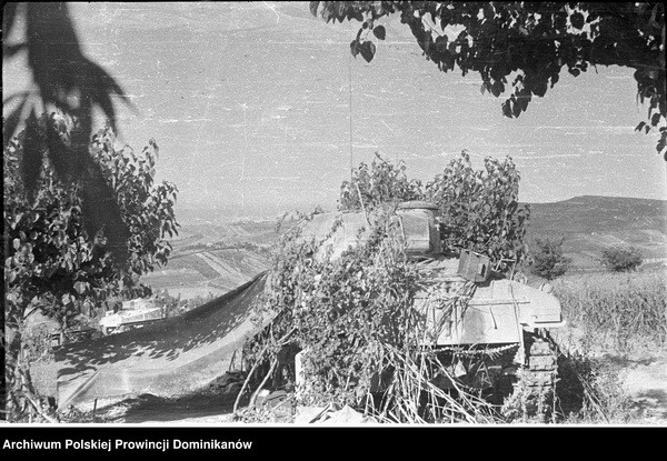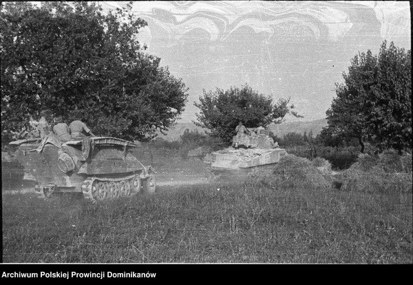 Po lewej zdobyczny transporter półgąsienicowy Sd.Kfz 251/7 Ausf.D (wersja saperska). Pośrodku w oddali czołg Sherman III z Pułku 4 Pancernego „Skorpion”