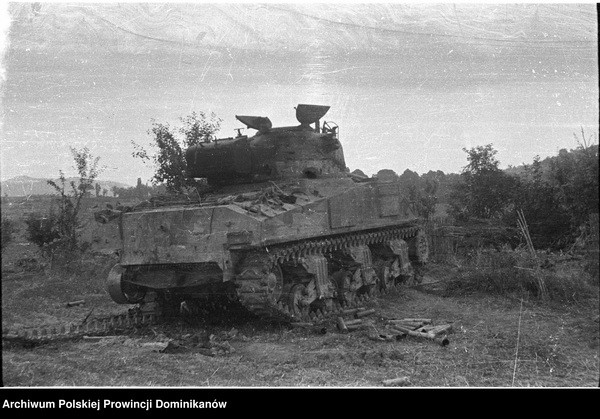 Zniszczony czołg Sherman III „SĘP” z 3 szwadronu Pułku 4 Pancernego „Skorpion”