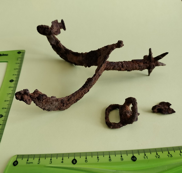 Wśród odkryć, które trafiły do Wojewódzkiego Urzędu Ochrony Zabytków w Lublinie Delegatura w Zamościu, szczególną uwagę zwracają trzy artefakty. Pierwszym z nich jest żelazna ostroga typu „molet” z kolcem gwiaździstym. Jej długość wynosi 15 cm, a rozstaw ramion sięga 11 cm. Ostroga wyposażona jest w sześciopromieniowy kolec o średnicy 4 cm, co sugeruje, że była używana przez rycerstwo od późnego średniowiecza (XV w.) aż do okresu nowożytnego (XVII w.). W pobliżu ostrogi znaleziono również prawie kompletną klamerkę do paska, co świadczy o jej codziennym użytkowaniu.