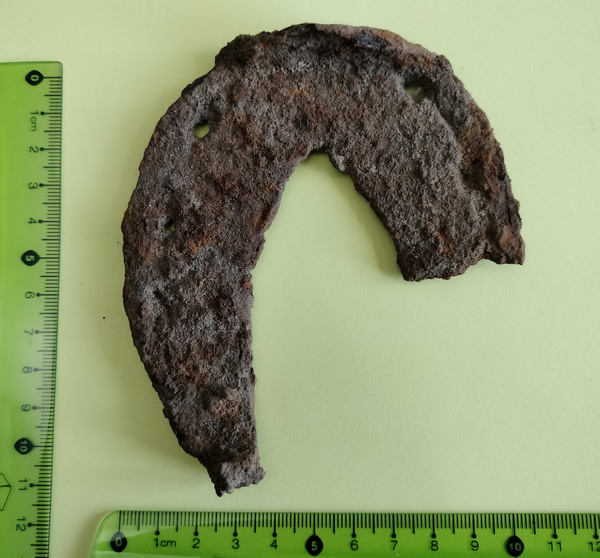 Ostatnim z ważnych odkryć jest żelazna podkowa kowalskiej roboty, o wymiarach 11 cm długości, 10 cm szerokości i grubości 0,5 cm. Podkowa posiada widoczne otwory na gwoździe oraz zagięcia dopasowane do kopyta końskiego. Jej datowanie również budzi pewne trudności – mogła być używana zarówno w średniowieczu (XIV-XV w.), jak i w okresie nowożytnym (XVIII-XIX w.).